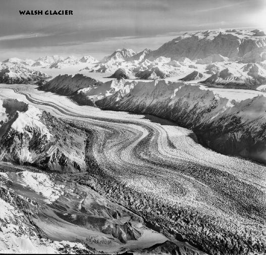 Walsh Glacier. Walsh Glacier, a large valley glacier flowing from an icefield in the Saint Elias Mountains. The massif culminating in Mount Logan and Mount St. Elias, the two highest mountains in Canada, is visible in the background.