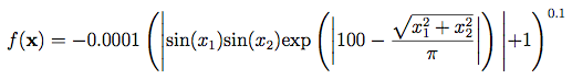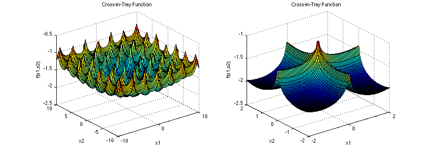 Dimensions: 2The Cross-in-Tray function has multiple global minima. It is shown here with a smaller domain in the second plot, so that its characteristic "cross" will be visible.