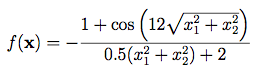 Dimensions: 2The Drop-Wave function is multimodal and highly complex. The second plot above shows the function on a smaller input domain, to illustrate its characteristic features.