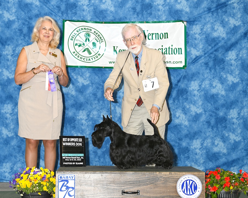 ![]() Barclay winning the Scottie Specialty Sweepstakes under Pilar Kuhn, January 11, 2019 with co-breeder Darlene Lenfesty |