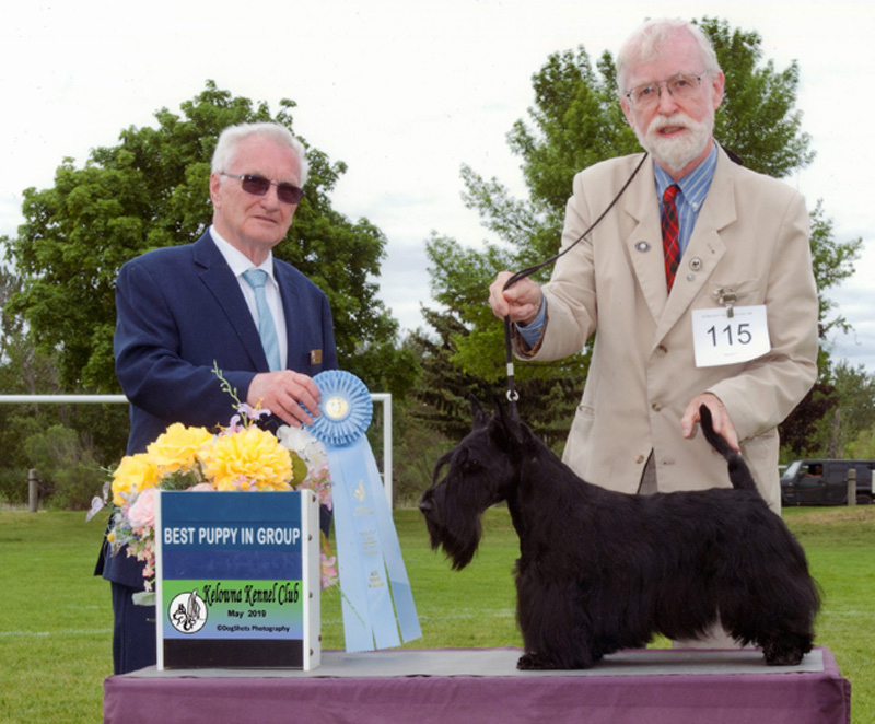Barclay winning Best Puppy in the Terrier Group at his first Canadian show at 7-1/2 months, Feb. 24/19, with proud owner Maggie; show photo below |