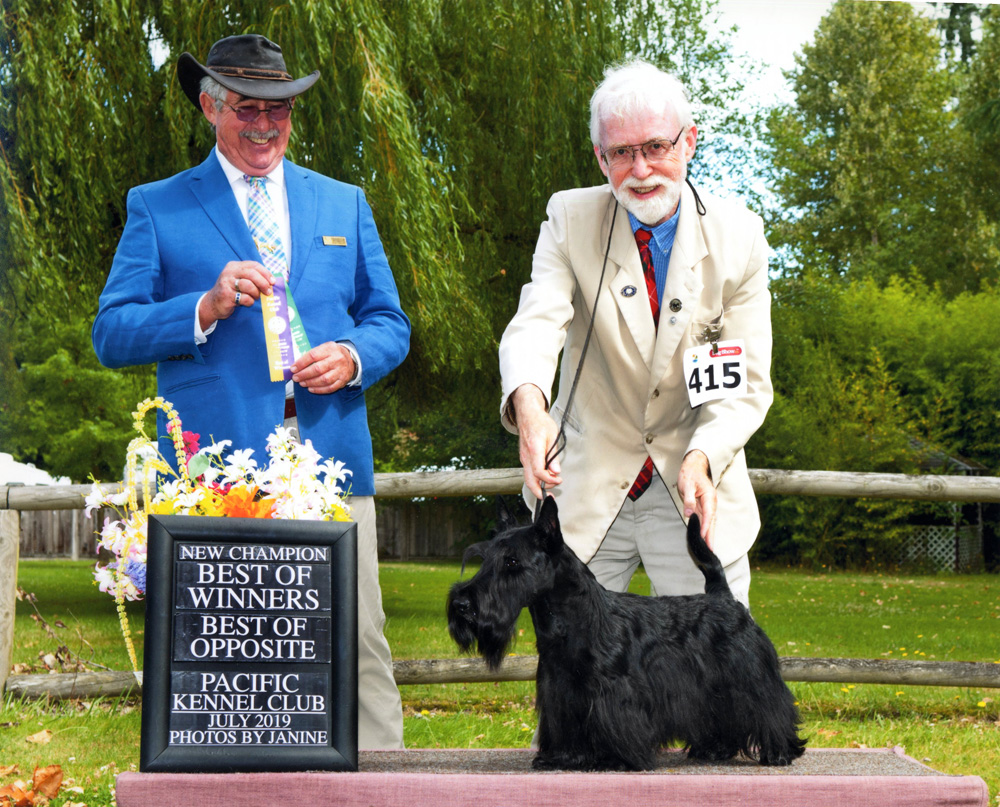 ![]() Sister "Sadie" finishes in style at the Regional Scottie Specialty under Terrier Breeder judge Bruce Fraser, with a 3-point Best of Winners, plus Winners Female at the BCATC Specialty, Oct. 2019 |