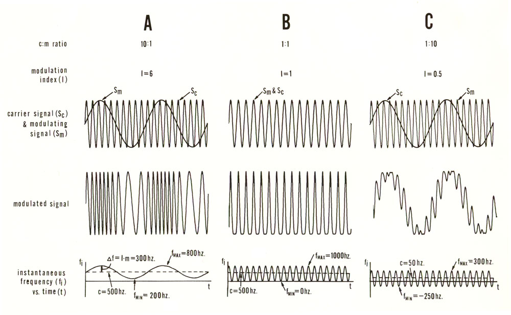By analogy to the radio sense of the term, frequency modulation is used in electronic and computer SOUND SYNTHESIS to refer to a similar process where both the carrier and modulating signals are in the audio range, or the latter in the SUBAUDIO range. If both are pure SINE TONEs, then the SPECTRUM produced consists of the carrier frequency c plus pairs of SIDEBANDs equally spaced about the carrier at a frequency distance equal to the modulating frequency m. The spectrum may then be described as: