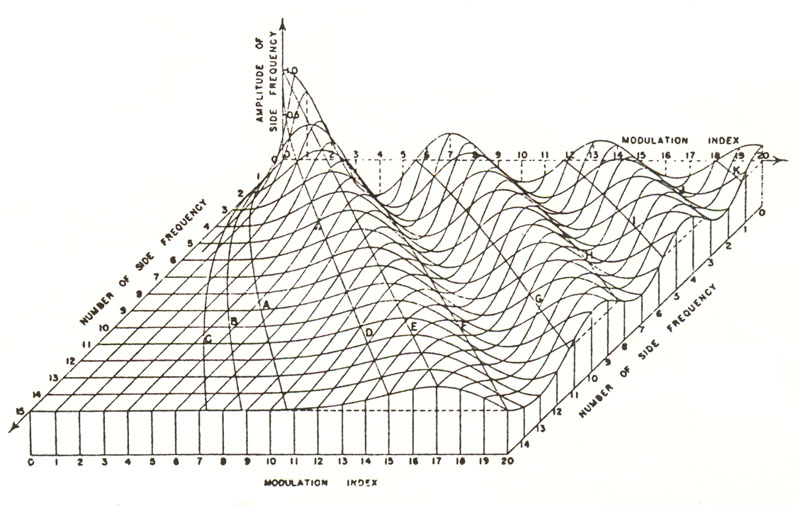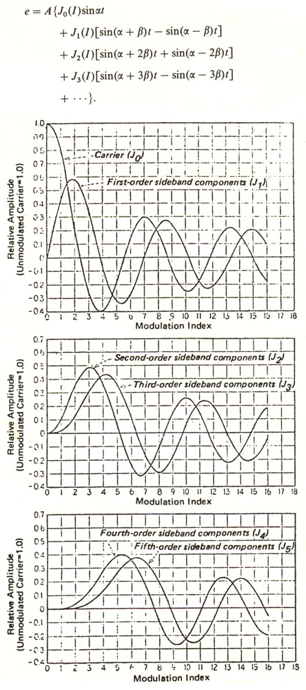 The strength of the sidebands depends on the MODULATION INDEX, which is the ratio of the amplitude to the frequency of the modulating signal. (Note that the amplitude of the modulating signal equals the maximum frequency deviation Df of the resulting wave.) That is, the stronger the amplitude of the modulating signal, the greater the number of sidebands which contribute significantly to the spectrum. Mathematically, the amplitude of the nth sideband is given by the nth order Bessel function for the given modulation index.