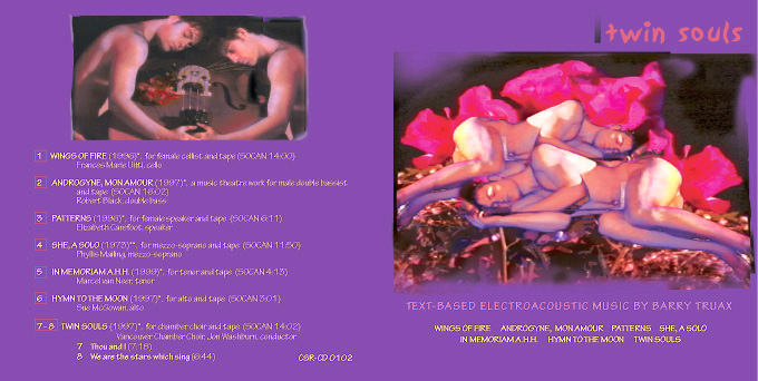 There is a compelling logic in the choices of Mr. Truax's music offered in Twin Souls, also from 2001. The unifying factor is best illustrated by two things: texts that deal with different approaches to personal relationships, and the writing for soloists accompanied by tape. ... The works that stand out are Wings of Fire, with cellist Frances Marie Uitti, and She, a Solo, the oldest work in this compilation with mezzo-soprano Phyllis Mailing. - alcides lanza, Computer Music Journal 27(2), 2003, p. 118.With Song of Songs, Barry Truax ... opened his palette up to a world of lushness and sensuousness - a welcomed change for those growing tired of the clinical inwardness of contemporary music ... Twin Souls, which is a CD devoted to works with love poetry and texts on sexual identity, leads off with a gentle touch with Wings of Fire with cellist Frances Marie Uitti softly guiding the lyricism of the piece and responding to the precise measured words of BC poet Joy Kirstin read by Ellie Epp. Another highlight is Androgyne, Mon Amour for double bassist Robert Black. This piece is a setting of six poems by Tennessee Williams read by Douglas Huffman. The poems dictate the music. Even when the words are placed in the background, their rhythms and vocal nuances invite the instrument and tape part to fuse sympathetically into one body and voice. Eerie and sparse, the final synthesis embodies the terrible loneliness endured by Tennessee Williams in his later years. - Darren Copeland, The Whole Note