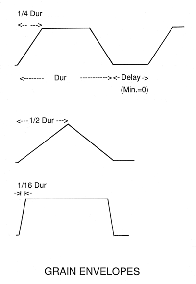 Key to all granular techniques is the grain envelope. For sampled sound, a short linear attack and decay prevent clicks being added to the sound. Changing the slope of the grain envelope, in classic microsound practice, changes the resulting spectrum, sharper attacks producing broader bandwidths, just as with very short grain durations.
