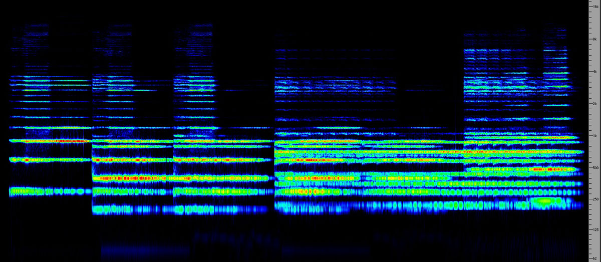 Note: Sung notes from 3 singers are used separately or digitally mixed into chords, each of which is convolved with the impulse response from Busetto Cathedral. All of these materials are also auto-convolved (i.e. convolved with itself) which lengthens the sound by a factor of two, and removes weak spectral components. The effect is a sound that is half way between the original voice and the reverberation of the cathedral. In the production score every track with the voice convolved with the impulse response is paired with its auto-convolved version (which is also convolved with the impulse response), thereby producing the "ghostly after-image" referred to in the notes. The spectrum of each chord and its after-image can be seen in the above spectrogram. A complete documentation of all materials, convolutions, tracks and spectrograms is available on the WSP Database (contact Barry at truax@sfu.ca for guest password).