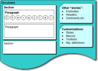 In addition to these parts of the main document, there are other special kinds of text which Word refers to as other "stories". These include footnotes, comments, headers and footers, and the like. These items are stored separately from the main text and require special commands to access and edit.