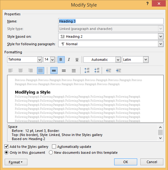 However, a few formatting options can't be set in this fashion. For those, you'll need the big style dialog. To see it, right-click the style you want to modify and choose Modify. You'll see the dialog below. Common formatting options are available through the buttons in this dialog; many others, including borders, bullets etc. can be accessed through the Format button in the bottom left corner.
