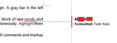 Turning on “Track Changes” in the Review toolbar allows writers to keep track of changes made to other people’s work (or by other people on their work.) Additions appear in colored, underlined text; deletions appear crossed out; and formatting changes appear in bubbles in the right margin. A gray bar in the left margin shows where changes have been made.