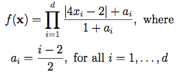 Kucherenko et al. (2011) use the values a0 = a1 = 0 and a3 = … = ad = 6.52. When used with ai = 6.52, for all i = 1, … d, they classify it as a Type B function, meaning that it has dominant low-order terms and a small effective dimension.In many cases, for instance in Marrel et al. (2008), there is the constraint that ai ≥ 0. They conclude that: