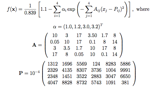 Dimensions: 4The 4-dimensional Hartmann function is multimodal. It is given here in the form of Picheny et al. (2012), having a mean of zero and a variance of one. The authors also add a small Gaussian error term to the output.