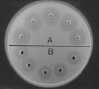 Demonstration of lysozyme activity in whole egg homogenate (A), compared with that of twice-crystallized hen's egg white lysozyme (700 ug/mL) (B). Plate assay (lysoplate) method, with heat-killed M. lysodeikticus incorporated in phosphate-buffered (pH 6.0) agarose gel. Samples (20 uL) were placed in wells, 3.5 mm in diameter and 4 mm deep, and the plate was photographed after 24 h at 20-22C. Dark zones around sample wells are zones of clearing due to bacterial lysis, and are proportional to the concentration of lysozyme.