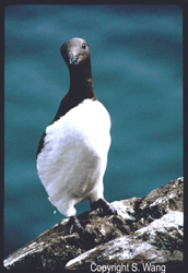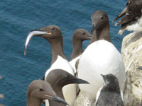 | Because they nest in the open, rather than in crevices or burrows as most other alcids do, one adult murre must remain with the chick to brood and protect it at all times. The off-duty parent delivers single fish several times per day. | ![]() |