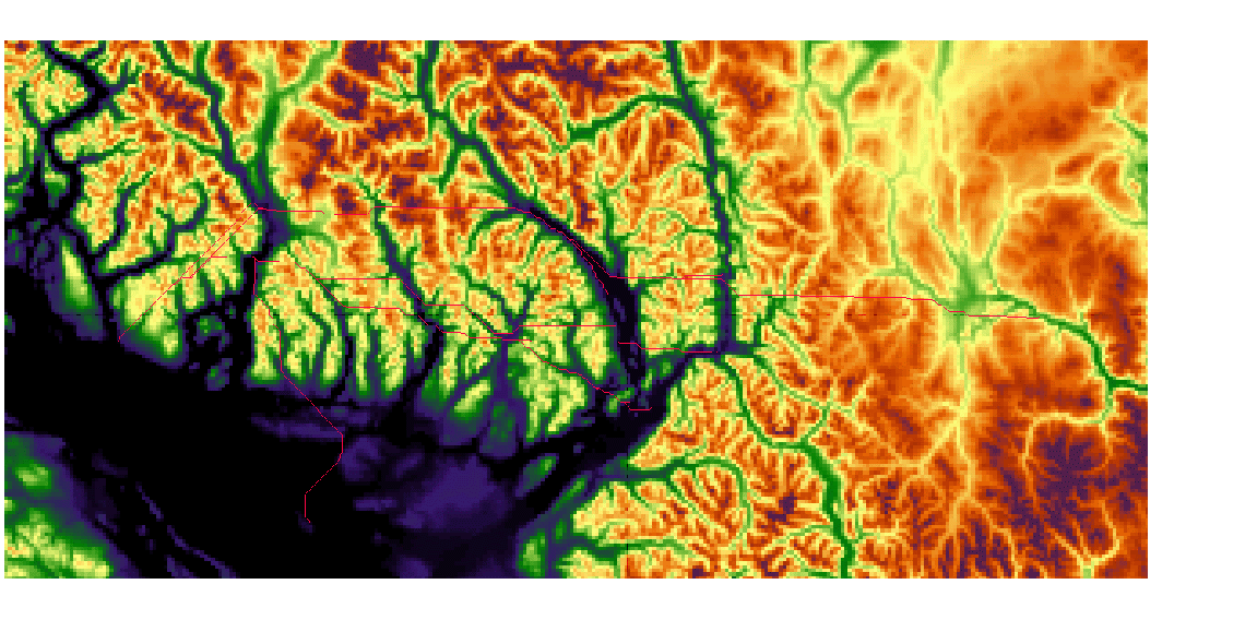 This image represents significant river friction least cost pathways shows the general trend towards travelling across the mountainous region instead of staying toward the Fraser River and the valley. This probably represents the need to cross the inlet to the east of the pathway end point in the west. As mentioned in the problems page, these paths cross the rivers at the most narrow point which may not be logical when considering rivers are most likely to be moving the most quickly at these points.