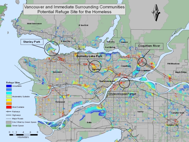 The above image was produced using the raster layer output of our MCE. Areas in orange and red have been identified as most suitable and areas in dark blue are least suitable. One area that jumps out right away is the region surrounding the Coquitlam River on the north east portion of the map. Having worked in that area for 7 years, I have seen the homeless population grow dramatically. The wooded buffer regions surrounding the Coquitlam River are dotted with homeless camps and offer great seclusion just a stone’s throw away from some key features. The area surrounding this is largely commercial with several restaurants and a supermarket. Moreover, this region is also home to a major rail works yard with trains passing through on a very regular basis. Another factor which compounds the homeless problems in this area is the fact that it borders the site of Riverview Hospital, which, until fairly recently was home to many people suffering from mental health issues. These factors combine to make this area a very suitable location for homeless refuge sites. Other sites that were identified by this model include, Burnaby Lake Park, a region of undeveloped forest in north Surrey (by the Patullo bridge) and, to a lesser extent, Stanley Park.