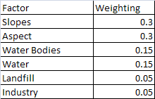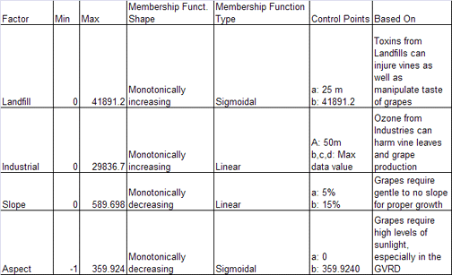 The files used for defining factors were the GVRD land-use, GVRD DEM, GVRD soil texture, and Water. The GVRD Landuse was reclassed to give a value of 1 to water, and also reclassed to give a value of 1 to industrial zones. The GVRD DEM was run through the module Aspect and Slope. The GVRD soil texture was reclassed to give a value of 1 to landfills. The reclassed files were then run through the Distance module: