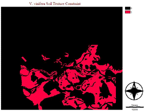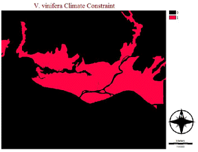 This species of grape produces over 90% of all the grapes in the world, it produces many of the most common wines such as Chardonnay, Merlot, Pinot Noir, and Sauvignon Blanc. V. vinifera is also one of the few old world species of grape and is the grape noted most frequently in the Bible (Weaver, 1976). This grape can survive on heavier soils such as clays, but it extremely sensitive to extreme climate conditions. This vine is killed at temperatures below 0 °C and must have limited rainfall as it is particularly susceptible to root rot. This species also prefers a long growing season and hot, dry summers. These factors were used to consider specific constraints and factors of this species for the multi-criteria evaluation.