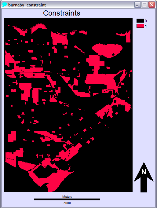Landuse The landuse image was assigned using the ASSIGN module. Values of 1 was assigned to the corresponding types of landuse while values of 0 were assigned to the areas not considered. As a result, a Boolean image (Burnaby_constraint.rst ) was created.