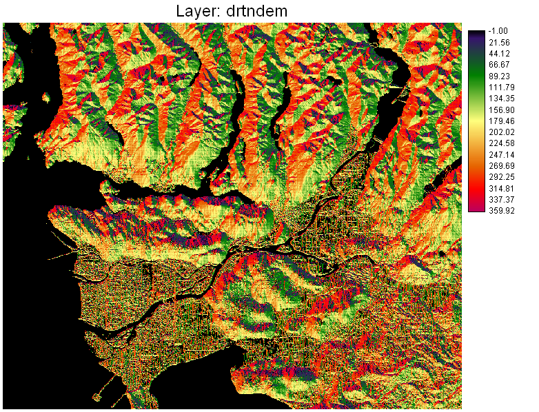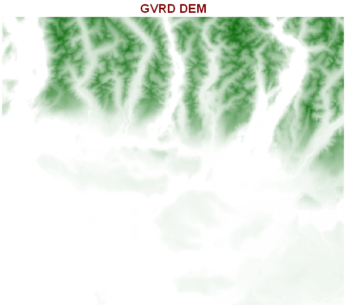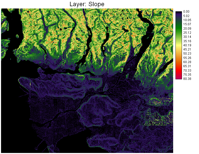 Digital elevation map (DEM) of the Greater Vancouver area is used to deduce both areas that are south facing and those that are relatively flat (less than 2.5 degrees).