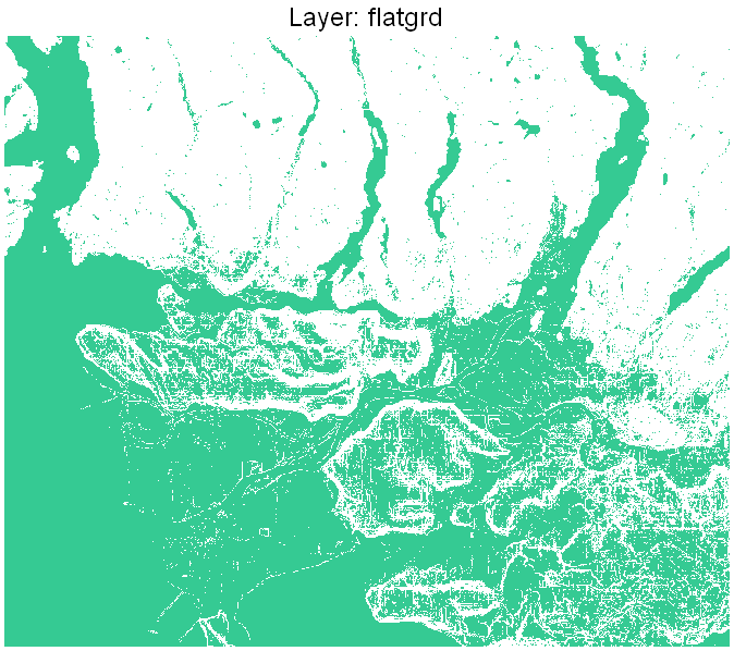 These are surfaces representing aspect (in degrees) and slope (in degrees). They are then reclassified using the module RECLASS, to find areas that satisfy the requirements (south facing and less than 2.5 degrees, respectively)