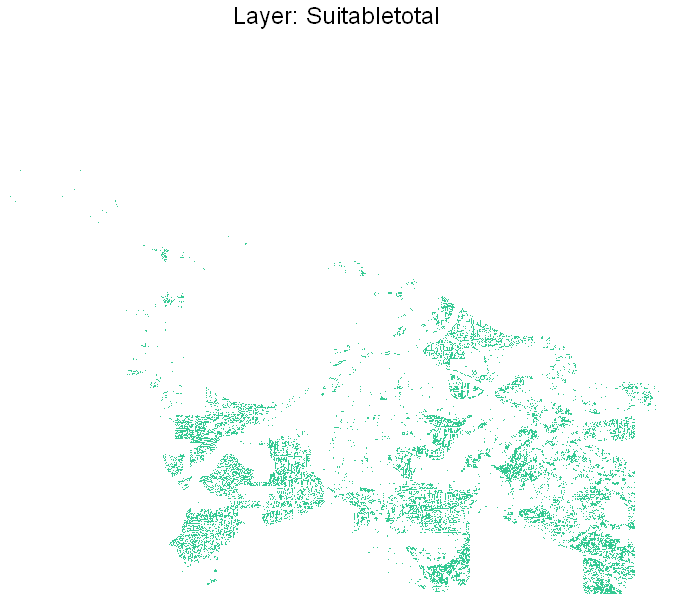 The five layers created, AVAILAND, NEARHWY, AWAYBCIT, SOUTHFACE and FLATGRD are overlayed in the IDRISI macro modeler, to produce the following: a layer called SUITABLETOTAL that represents all the areas that satisfy the requirements.