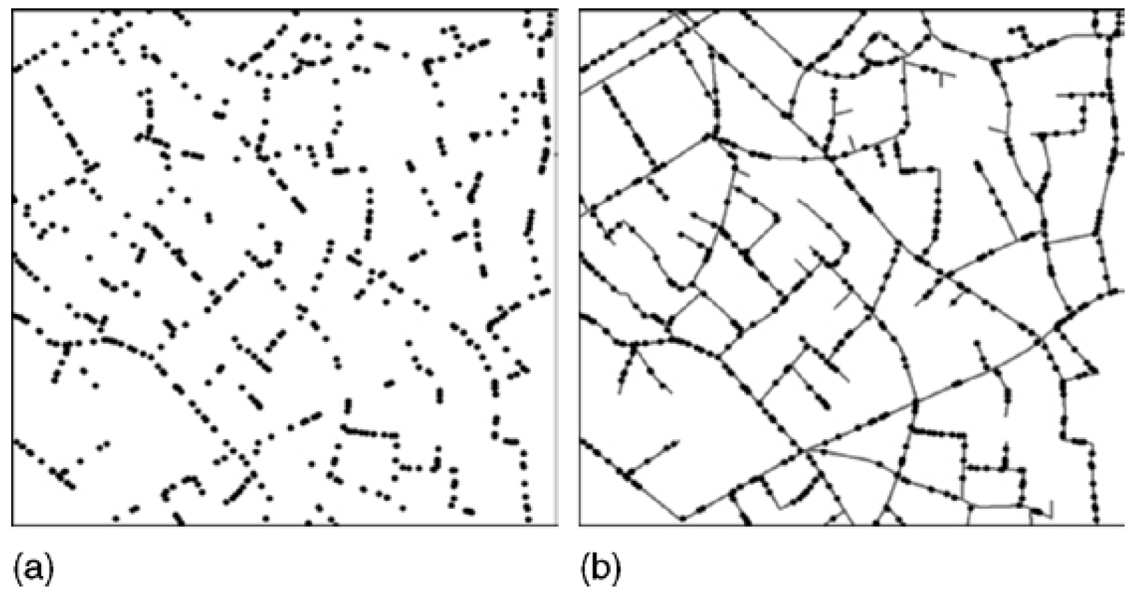 Figure 6. Non-randomly distributed points on a plane(a) and randomly distributed points on a network(b). (Okabe and Satoh 2009) (Click Image to Zoom)