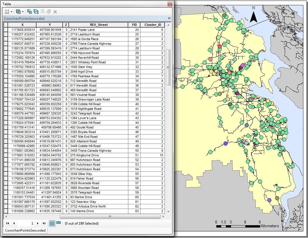 Figure 3. Patient addresses with cluster membership field (left) visualized in ArcMap (right). (Click Image to Zoom)