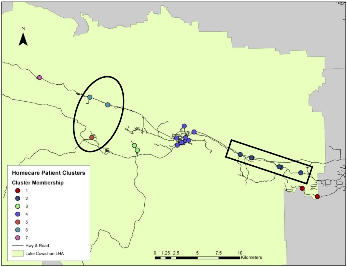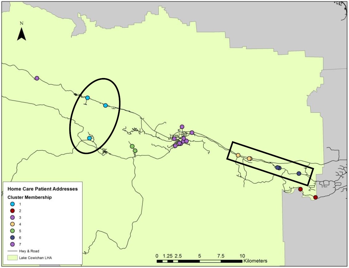 In addition to providing for the visualization of patient address cluster membership the model proved the validity of its theoretical foundation, successfully bypassing the limitations of Euclidean based proximity analysis, creating patient clusters that more accurately capture networked real-world processes. This is highlighted within the circles and rectangles in the Lake Cowichan LHA (Figure 4); the k-means clustering analysis undertaken in S PLUS, which uses Cartesian space and Euclidean distance measures, incorrectly clusters together patient addresses which are a great driving distance from each other. Conversely, the spatial network clustering analysis used in SANET correctly identifies these patient addresses as being a great distance apart and assigns them to different clusters. Additionally, the spatial network clustering method correctly identifies when patient addresses distant in Euclidean space should be clustered together in networked space, as can be seen in the rectangles. Once again, the Euclidean based clustering analysis fails to recognize this relationship and instead assigns these patient addresses to two different clusters.