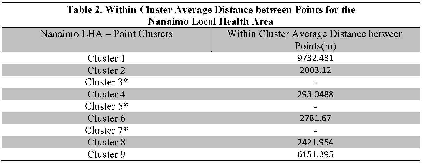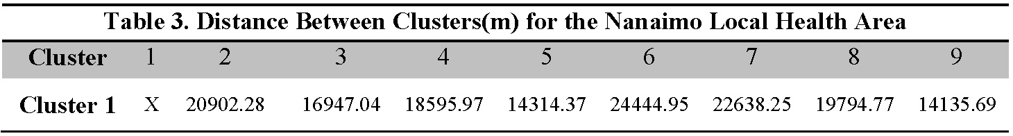 In addition to the success of the model, we were also able to calculate the distance between addresses within a cluster and the distances between clusters along a weighted network. Within cluster distance (Table 2) and cluster to cluster distances (Table 3) for the Nanaimo LHA are provided. In both cases, by measuring the distance from every patient address to every other patient address and taking the average we provide a measure reflects the flexibility afforded VIHA home support workers in organizing their day.