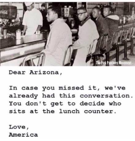• Using images like this to argue against Arizona's anti-gay law bill without, at the same time, articulating a clear anti-racist and anti-colonial critique reproduces the same politics. The fact is, there are plenty of restaurants and other public services that people of colour and Natives avoid, or where they are openly discriminated against. To suggest that the lesson has been learned, that there is not still discrimination at lunch counters, erases contemporary racism. We know too well that racism and settler colonialism is alive and well in America, and elsewhere.