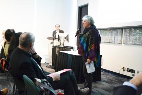 Above, IPinCH Director, George Nicholas, introduces the event planning committee (from left to right): Alexa Walker, Brian Egan, Dorothy Lippert, Daryl Pullman, and Alan Goodman. At right, audience member Vicki Kelly asks a question during the symposium Q & A period (photos: K. Brown).