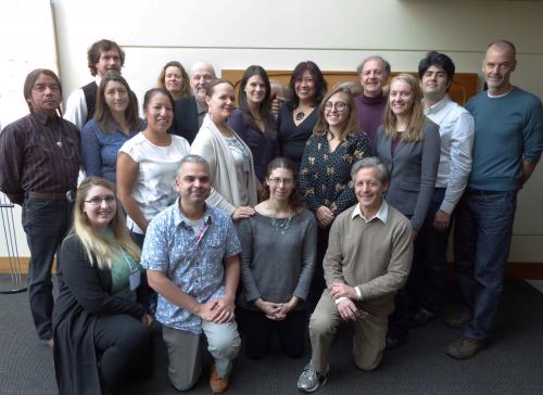 A group shot to close out the last day of the workshop on October 24 (from top left): David Schaepe, Cressida Fforde, Daryl Pullman, Alexa Walker, Kim TallBear, George Nicholas, Ernesto Schwartz-Marin, Brian Egan, Armand Minthorn, Rosalina James, Dorothy Lippert, Jessica Bardill, Sara Juengst, Teresa Nichols, Chelsea Meloche, Ripan Malhi, Deborah Bolnick, Alan Goodman (not pictured: Susan Rowley. Photo courtesy G. Nicholas).