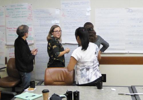 Above, David Schaepe, Armand Minthorn, and Brian Egan participate in discussions during the two-day workshop from October 23-24 at the SFU Centre for Dialogue. At right, workshop participants Alan Goodman, Sara Juengst, Deborah Bolnick, and Dorothy Lippert brainstorm and discuss outcomes from the workshop (Photos courtesy G. Nicholas).