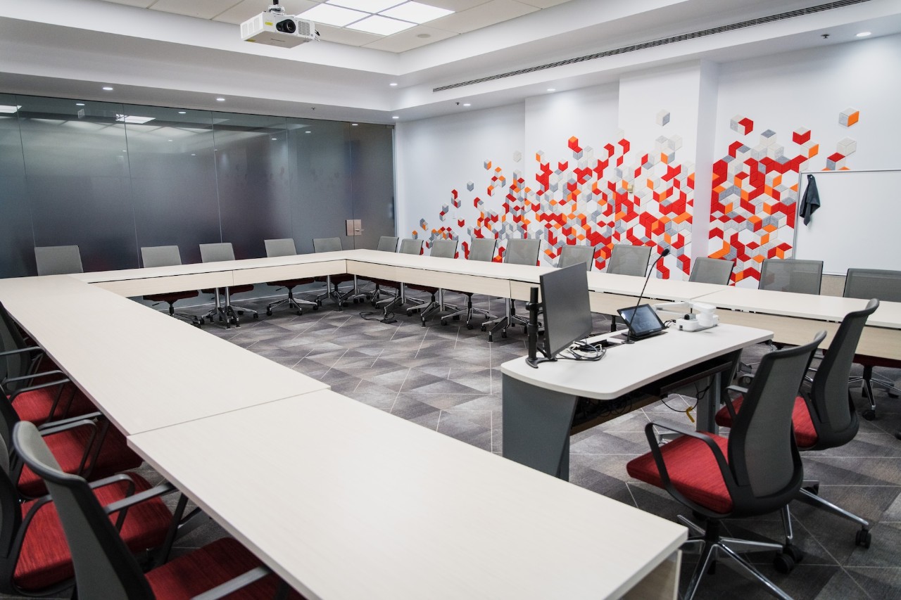 Designed for interaction and presentation, policy rooms feature fixed-tiered seating set in a semi-circle, electronically operated screens and variable lighting. Capacity is 46 with additional space for a wheelchair.