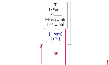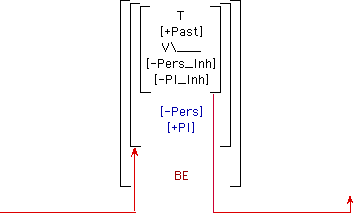 Nest, where does the link fit into the above structure. Since T,[+Past] governs V, the link should descend directly from the innermost set of brackets (it directly contains V). The link transferring the information of person and number to T should ascemd dorectly to the second set of brackets, which directly contains person and plural. (We have to use a different graphics program to illustrate this since the one above cannot display straight lines):