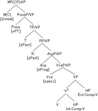 (10) [MOOD [-Irreal]] <SP [S] < [TENSE [+Past]] <[R[-Perf] <Asp[-Prog] <Vce[-Pass]< BUY <theme: A BOOK> <agent: JOHN[+PT] >>