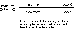 j) See e) above. Actually the passive does not need to be listed. The passive is 99% predictable. A post-lexical rule marks which argument will be assigned depending on the voice that is selected. We didn't have to time to get into voice properly. You can check my previous 322 notes on that.