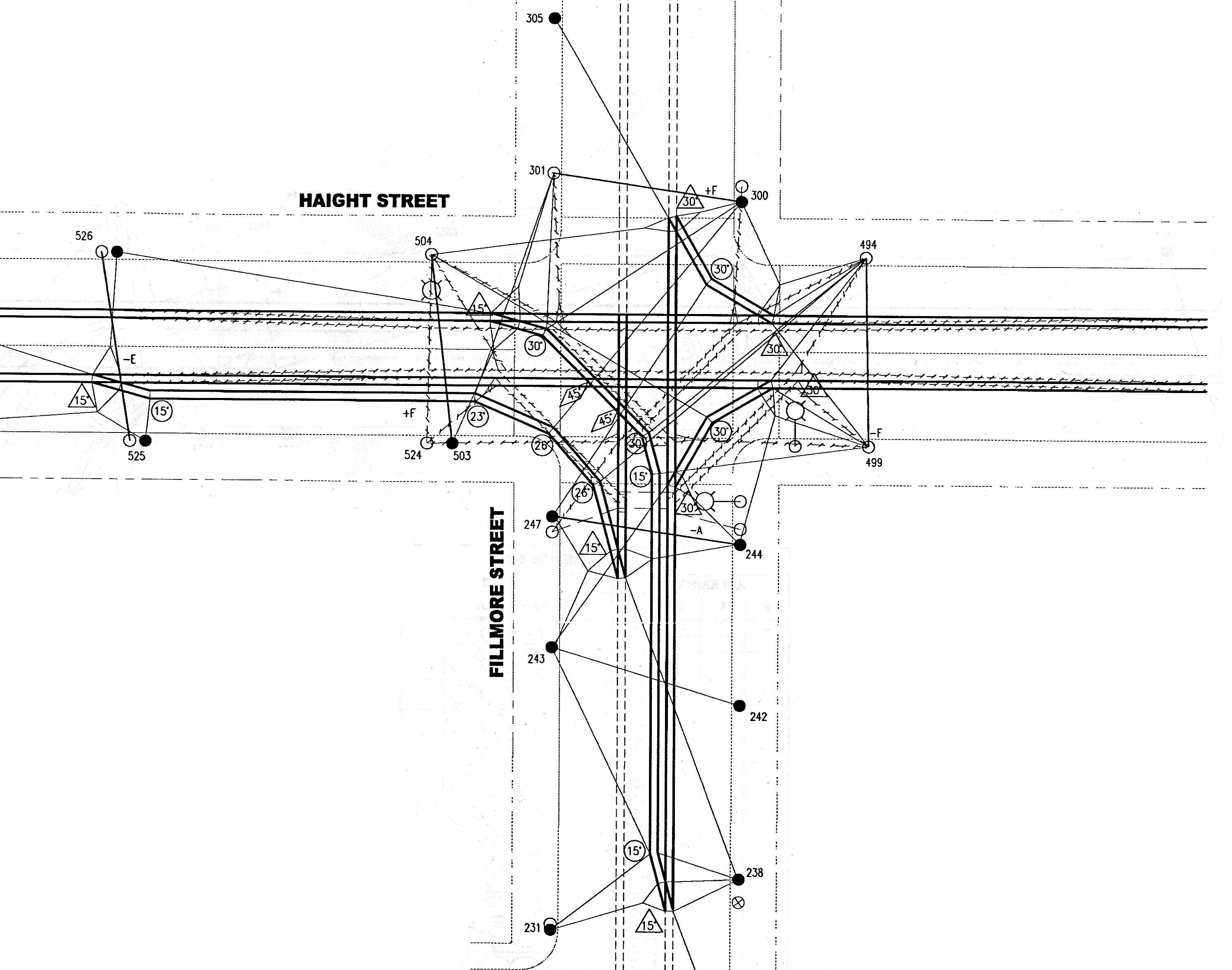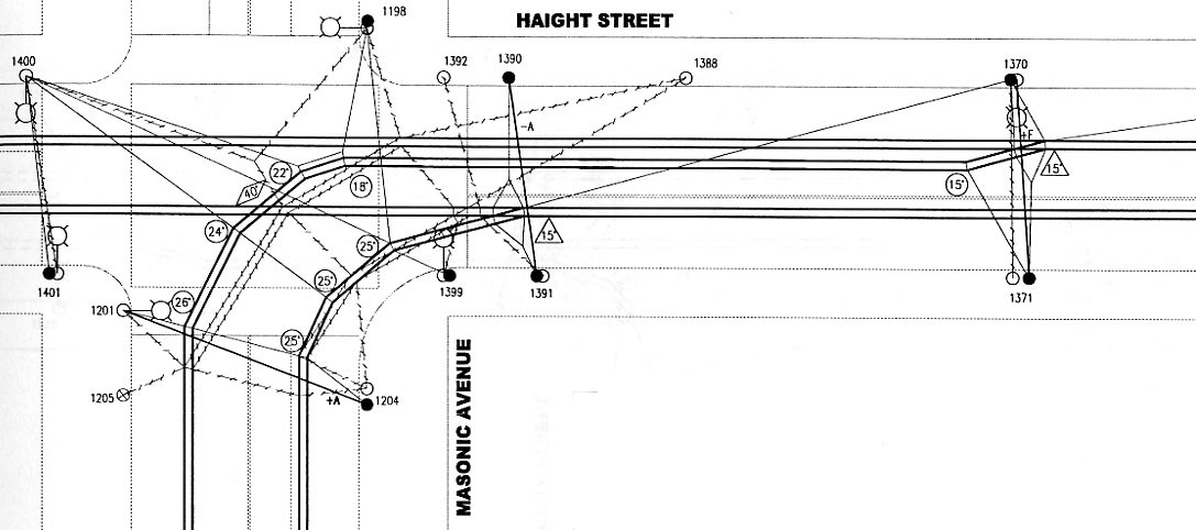 The revised overhead constructed in 2003 at Haight St. and Masonic St. The dashed
