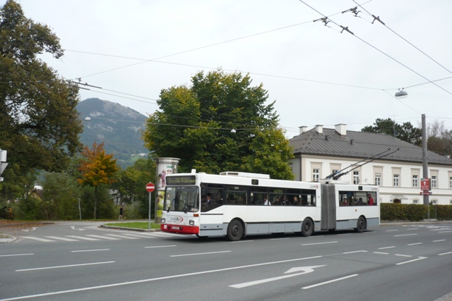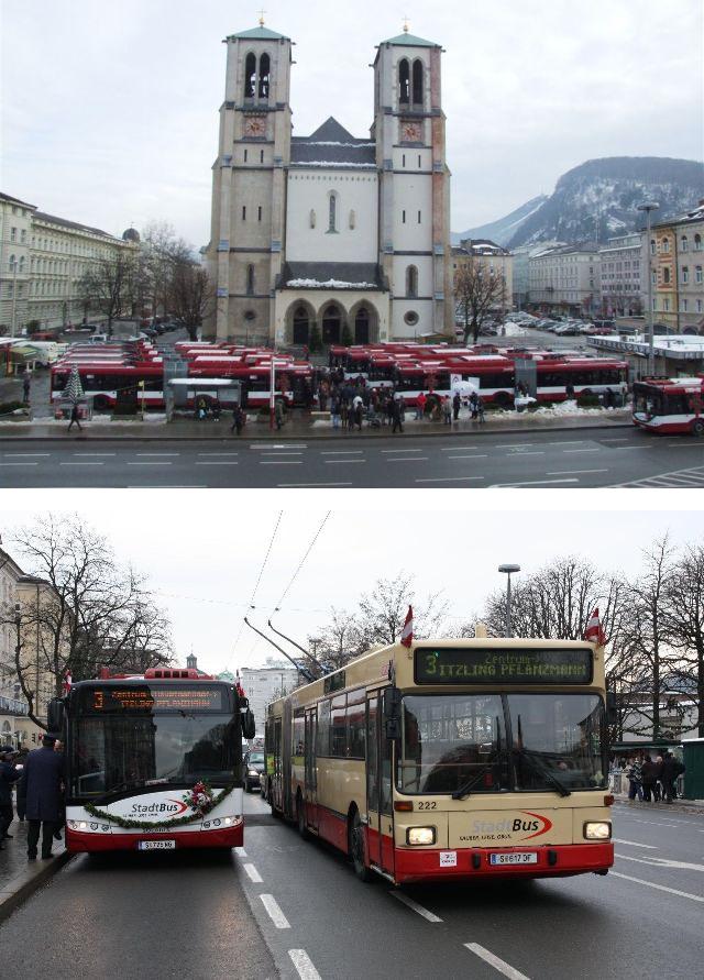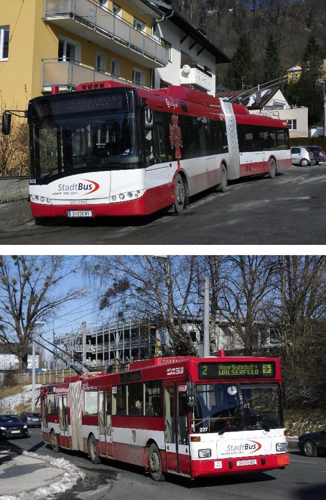 Upper photo: Solaris Trollino 305 at the Gaisbergstraße Parsch terminus of route 6 ready to return to the city centre. Lower photo: Gräf & Stift 227 in the new red and white colour scheme. The extension of routes 8 and 10 has been approved. Photos by Gunter Mackinger. Circa 2010. Courtesy of TrolleyMotion.
