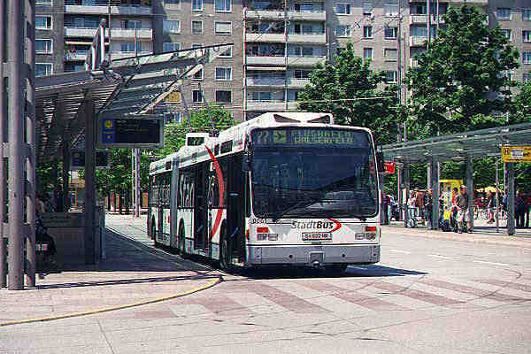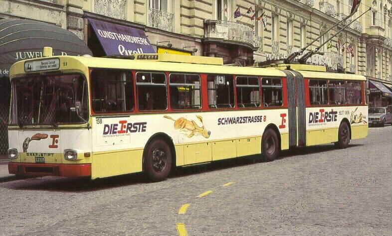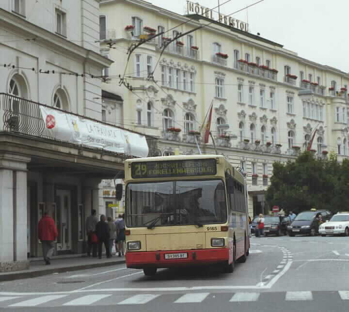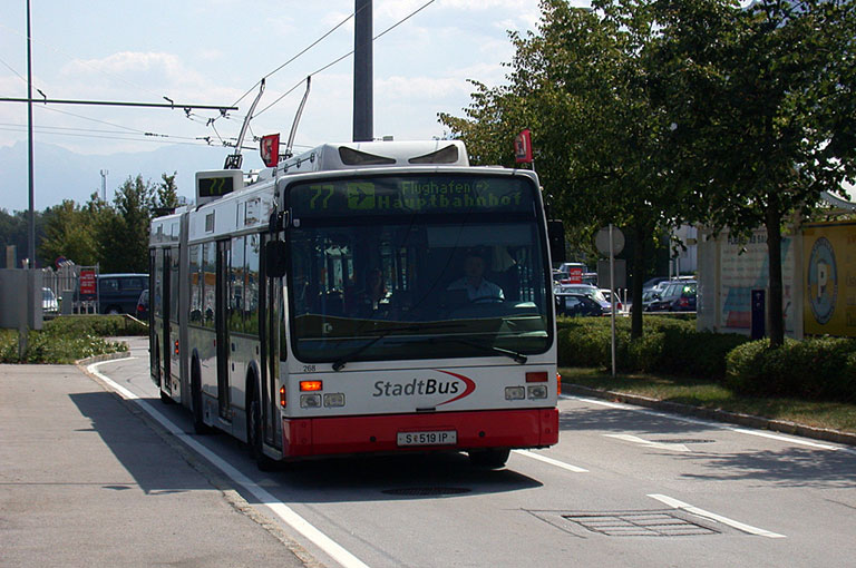 Van Hool low floor 0061 on Route 77 in Salzburg. note the route indicator on the roof on the right side. Photo by John Gilmour. 2002.