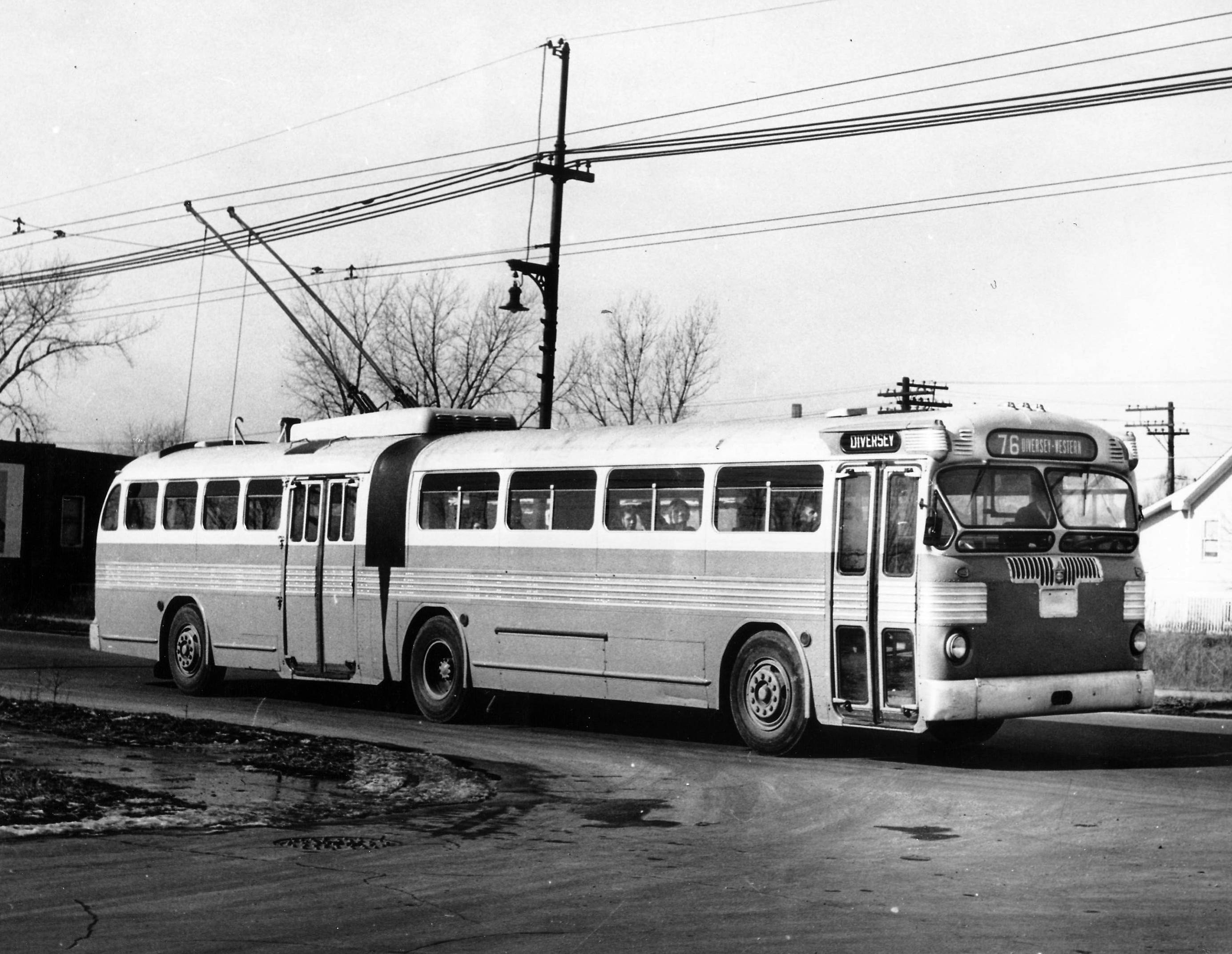 The Cristalis Trolleybus at the Irisbus test track in Lyon. Picture taken on a tour of London local authority leaders and officials, who were suitably impressed. Photo by Ashley Bruce. The photo on the second from the right by Paul Weyrich, submitted by Ken Josephson. It commemorates 35 years at the time of his submission since the sad closure of the system on 20 JN 65. On the same date route 47 in Chicago closed. This saw the beginning of the demise of the Chicago system with the first major closure. Centre left: the Queen Mary, the first articulated trolley built in the United States, built by Twin Coach. It could only bend vertically, not horizontally. It ran in Cleveland, Ohio. The photo on the right of the centre is the second-to-the-last last known double decker trolleybus known to be built. It was an experimental trolley by S. Yorkshire. It now resides in a museum. The honour of the most recent double-decker trolley now goes to the Hong Kong Trolley. See the Hong Kong photo page. The next photo is Wellington's new Designline 301 trolleybus built for Stagecoach. The antepenultimate photo is of a new Beijing 16m. articulated trolleybus. The antepenultimate photo is of Nancy TVR trolleybus, which uses twin wires for power and a single rail guidance system. The penultimate photo is of the Queen Mary, the only articulated trolleybus to operate in Chicago. Like the one in Cleveland, it could bend only horizontally, not around curves. It was manufactured by Twin Coach based on their post-war model. The penultimate photo is of an articulated Hess from St. Gallen with an extra articulated unit added it. It was presented in St. Gallen on 20 DE 05. The penultimate picture is a Brill advertisement promoting their new ACF-Brill trolleys. The last picture is a Marmon-Herrington ad for MHs in snow and sleet
