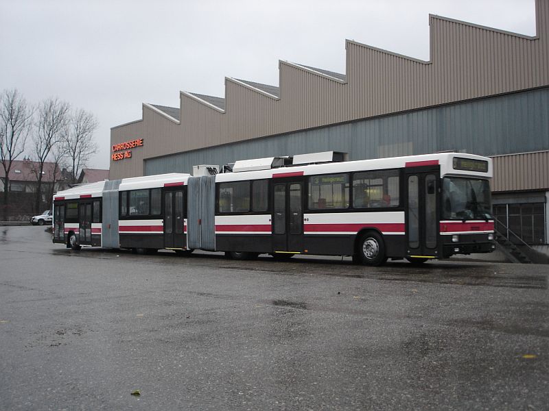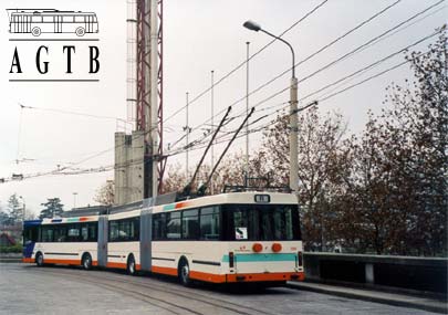 A test model of a double articulated trolleybus, number 721 (ex-709) in Geneva. It is built out of articulated trolleybus NAW/Hess/Siemens in the fleet plus a new centre section built by Hess. Axles A and D are steered, axles B and C are motored. The second driving motor is built on the new B-axle 10 of these have been ordered from Hess/Kiepe-Vossich as brand new trolleys.