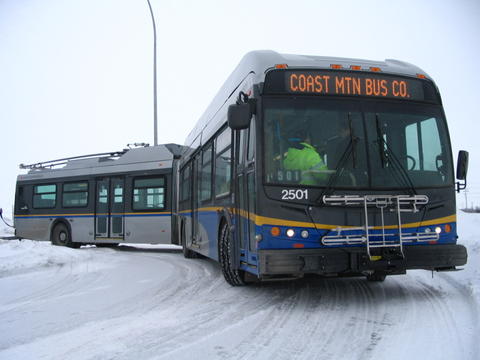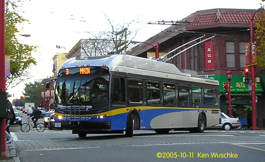 The first NewFlyer articulated trolleybus is in the first picture. Photo by Derek Cheung. One of the first photos of NewFlyer 2101 at the Winnipeg factory. It is towing a power trailer for testing purposes, which is barely visible behind the coach. Photo by Derek Cheung. June 2005. In the second photo, the original 2101 is on route 25 Victoria. Photo by and retouched up by Bill Volkmer. Date unknown. It is operating on route 20. Photographer unknown. In the fourth photo 2101 is turning onto Pender St. from Main St. on route 3 Main. Photo by Ken Wuschke. 27 SE 05.