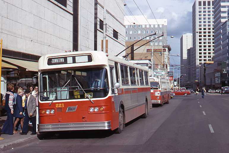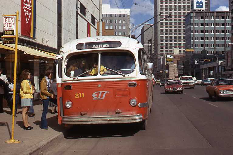 New Flyer E-800 221 in downtown Edmonton. Photo by Angus McIntyre. SEP 1975.