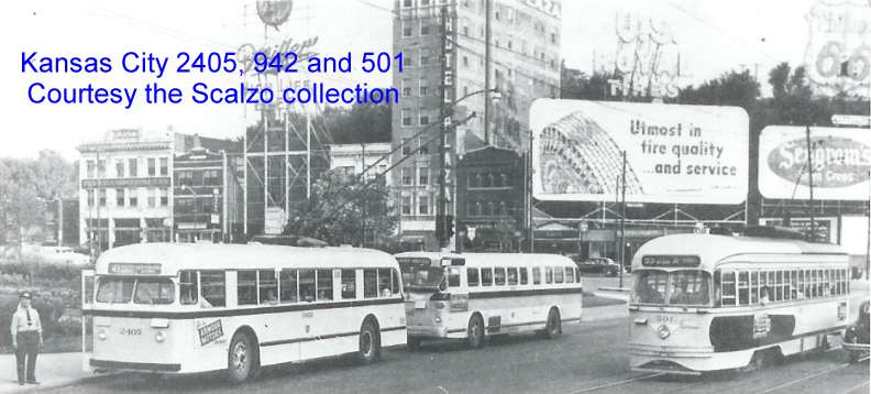 1945 Brill TC44 2405, Twin Coach bus 942 and PCC 501. Courtesy of the Steve Scalzo collection. Photographer and Date unknown.