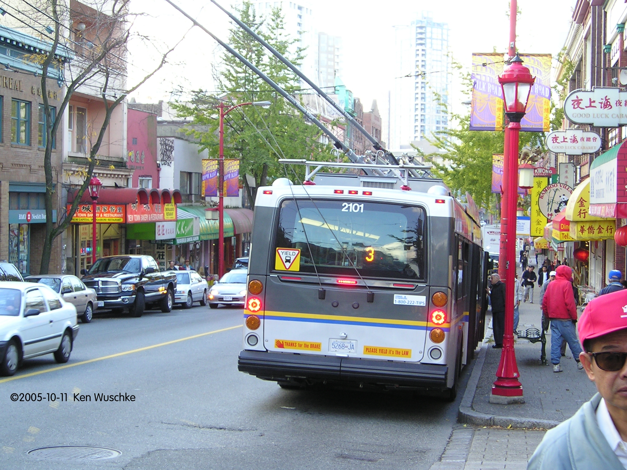 New Flyer 2101 on Pender between Main and Columbia, where it will turn right, its new terminus. Photo by Ken Wuschke. 11 OC 2005.