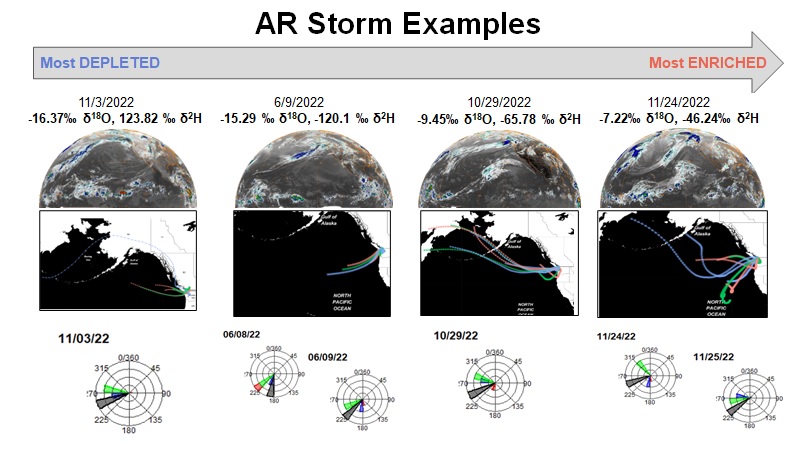 Atmospheric River (AR) Events and Nitrate Contamination This study is focused on attempting to fingerprint ARs using information on the storm characteristics and trajectories, as well as the stable isotope composition of the precipitation. Waters were also sampled during and following precipitation events in a dominantly agricultural watershed, and analyzed for their isotopic composition and nitrate concentration. Data are being used alongside numerical modeling to determine how AR events may impact nitrate mobilization.