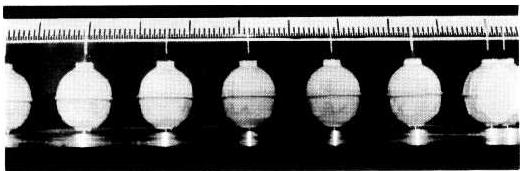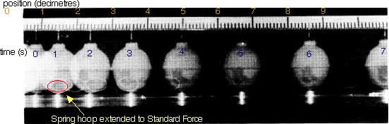 These questions are illustrated in the figure. Experimental tests have been done. You may have a chance to do some in the lab. Very precise tests can be done with well designed frictionless pucks and a special spring shaped like a hoop. When the hoop is distorted from a circle it is pulling on the object to which it is attached with what we will call the Standard Force. If two hoops have the same shape then, individually, they have the same accelerating effect on the frictionless puck. A photograph of the puck at 1 s intervals allows us to find its acceleration.