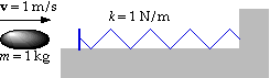 Think of a block moving right toward a spring bumper. Before the block hits the spring, it has a speed of 1 m/s. The blocks mass of 1 kg and the spring has a spring constant of 1 N/m.